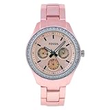 Fossil Stella Boyfriend Pink Dial Women's Watch ES2975 With a borrowed-from-the-boys style, this blush aluminum women's piece has a dramatic large case and a multifunction face. A glitzy top ring adds a feminine flair.