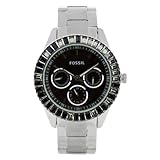 Fossil Women's ES2957 Stainless Steel Analog with Black Dial Watch Dress watch, Japanese quartz movement, Multifunction, Polished silver-tone hands with luminous accents, Polished silver-tone markers, Small white numbers and indices, Polished stainless steel silver-tone bezel set with black and clear baguette crystals, case, crown and screw-down caseback, Brushed/polished stainless steel silver-tone adjustable link bracelet with a push button fold over deployment clasp, 50 meters/165 feet water resistant